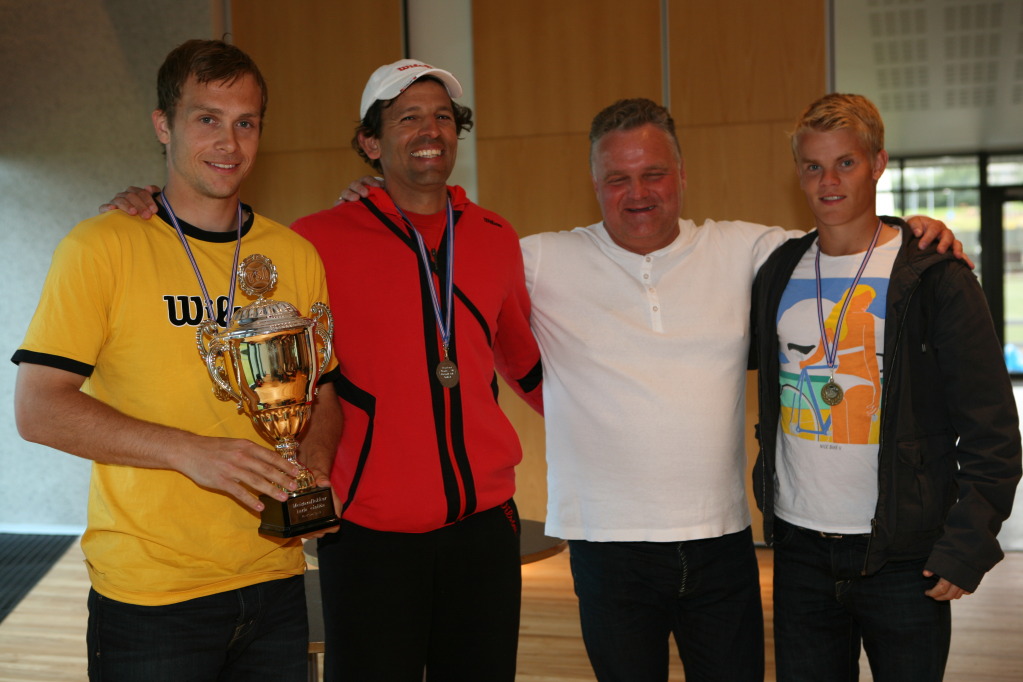 Verðlaunahafar í meistaraflokki karla ásamt Helga formanni. F.v. Arnar (1.sæti), Raj (2.sæti), Helgi formaður og Birkir (3.sæti)